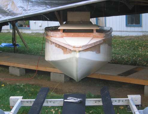 Intrepid is at peace again, under the building shelter. I will complete the remainder of the boat while it is on the trailer. This is one of those milestones in the boat building process that deserves a really big smile, as evidenced by my s*** e***** grin!