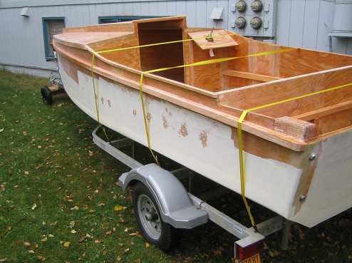 After Intrepid was placed on her trailer, she was secured for towing and brought out from under the building shelter. We are going to pick up her motor!