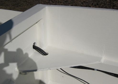 You can see how the notched port-side stiffener fits around the butt plate in this photo. You also may be able to see a row of dark spots about a third of the way down from the coaming to the stiffener. These are screws attaching the rub rails from the inside. I still have to seal them over with epoxy putty.
