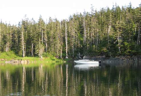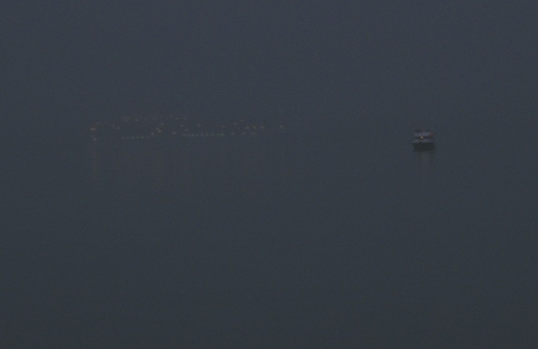 When I got to Whittier, it was already dusk and the area was socked in with fog. Since there was no wind, I decided to launch anyway. I traveled about five miles in the fog, guided mostly by my Garmin GPS unit. I anchored in Shotgun Cove for the night. Another boat decided to anchor in the same cove. Those faint lights you see in the distant background are not on shore-they are coming from a passing cruise ship a little over a mile away, heading into Whittier.