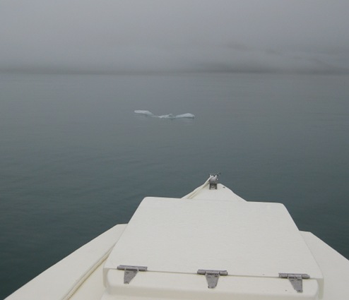 The further I progressed into this 14-mile long bay, I kept coming across an increasing number of large floating chunks of ice. Ahead, my route seems to be blocked by an impenetrable bank of fog.