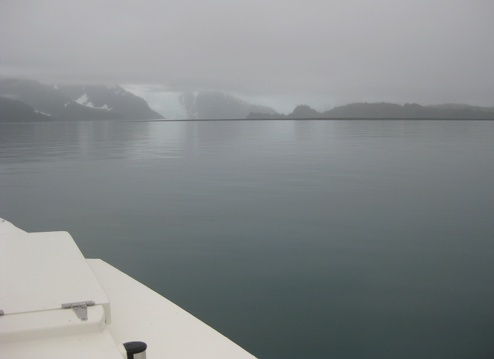 I traveled through the dense fog for about three miles. I couldn't see but 50-feet in any direction. When I broke through the other side, the clouds lifted to about 800 feet, but they then released a constant light rain. Still seven miles distant I can see what appears to be Beloit Glacier. Willard Island is on the right, and that skinny dark band of land that appears to start at the base of the island and extend to the left in the bay is a terminal moraine, left over from the last time the glaciers advanced. According to my chart, there is supposed to be a break in the moraine that is at least 3 fathoms deep. I am currently in 192 fathoms of water. In case you have forgotten, a fathom is 6-feet. 192 fathoms is 1152 feet. This is one deep bay. No wonder why the next day I had a whale come right by my boat.
